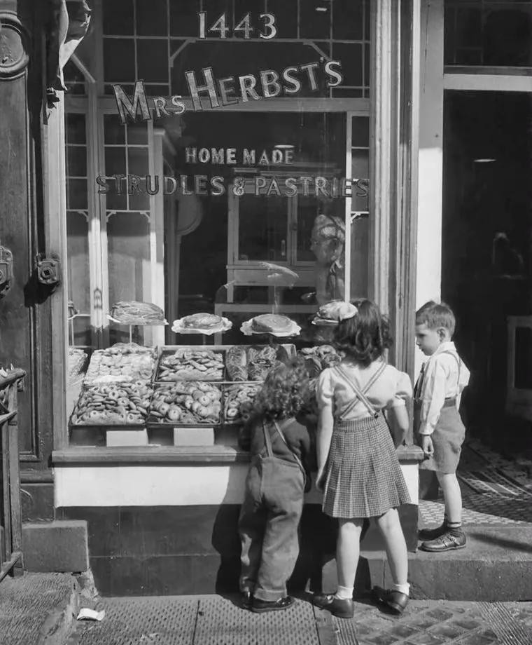1960年,纽约市,三个孩子站在赫布斯特夫人面包店的橱窗前。