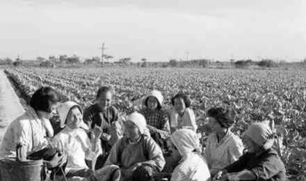 工人家属、川沙县严桥公社同心生产队第五小队队长朱林妹(左二),热爱农业劳动,坚定不移办农业,是工人家属中积极参加农业生产的一面红旗。1958年,出席了全国妇女建设社会主义积极分子大会,1960年“三八”节时又获得了全国三八红旗手的光荣称号。
