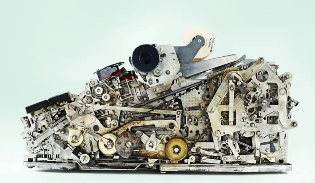 上个世纪,这是一款机械计算器被拆除外壳之后的侧视图。它的商品型号是Marchant EFA,在电子计算器问世前,在上世纪五六十年代这款机器和它的诸多同类一起,在欧美盛行了一个时代。它们的内部由各种机械齿轮、杠杆和弹簧等构成,零部件总数可达上万个,人类大脑真是太聪明了。