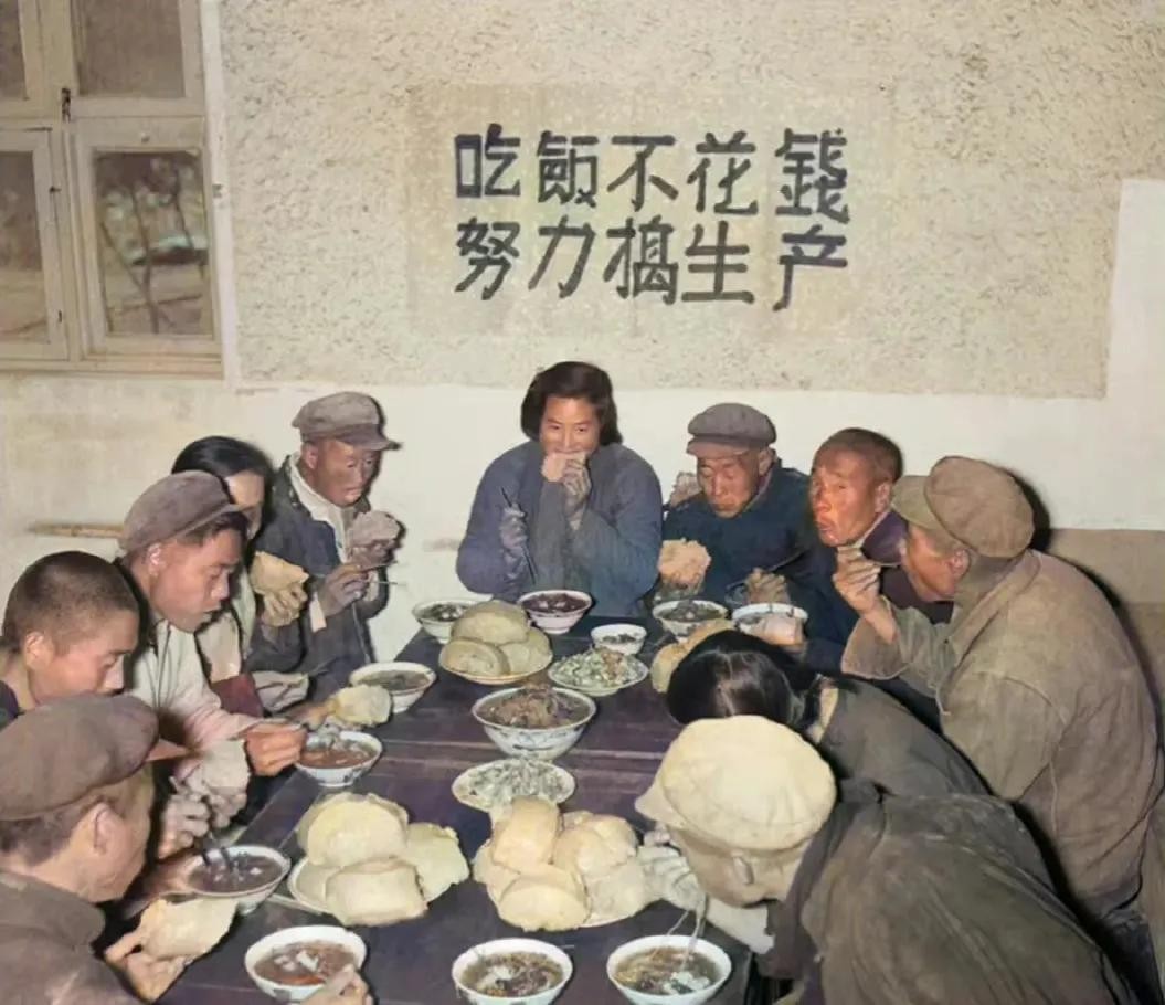 1958年,湖北随州,社员们吃“大锅饭”的现场老照片。仔细看墙上写着当时的宣传标语:吃饭不花钱,努力搞生产。