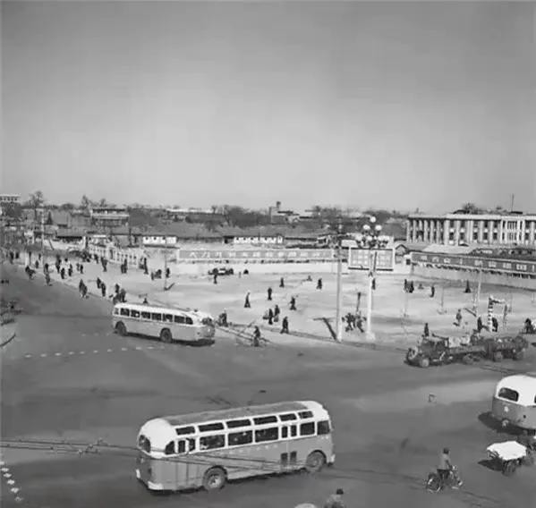 1960年,西单路口东北方向。内城的有轨电车已全部取消。东北角辟为了体育场,一直延续到七十年代末。右拐向西单北大街的是22路公共汽车(新开通,前门开往北太平庄),开进西长安街的是郊区线37路(西单开往石景山),路口中东行的是10路(南菜园开往北京站)。