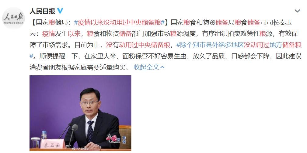 国家粮储局在4月4日也出来发声:疫情以来绝大多数地区没动用过储备粮食。