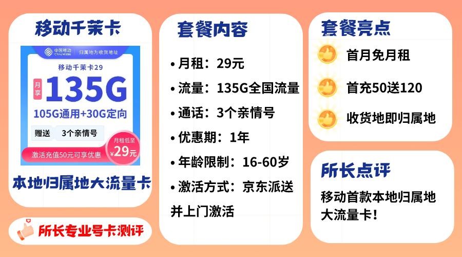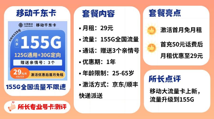 这也是所长目前接触的首款优惠力度这么大的套餐!因此可以享受千东卡首年29元月租包含155G全国流量+3个亲情号+0.19元/分钟。
