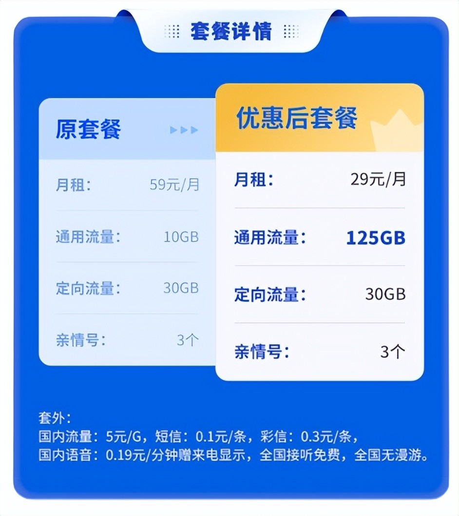 ● 首年套餐:29元月租=125G通用流量+30G定向流量+3个亲情号免费拨打+0.19元/分钟通话