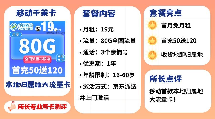 ● 首月套餐:首月免费使用,0元月租免费体验移动千东卡