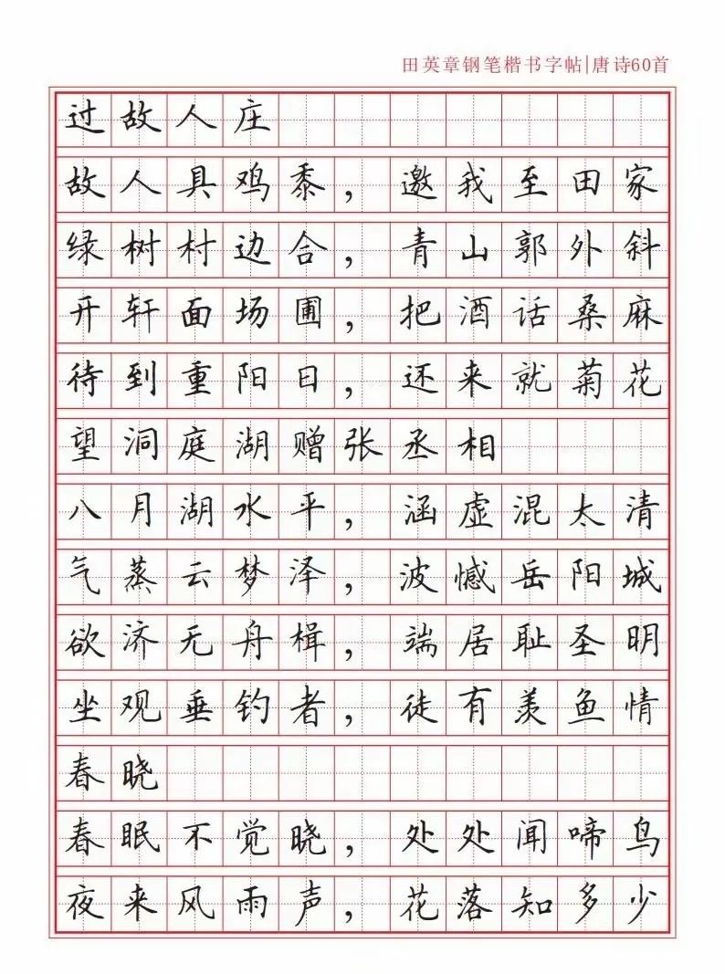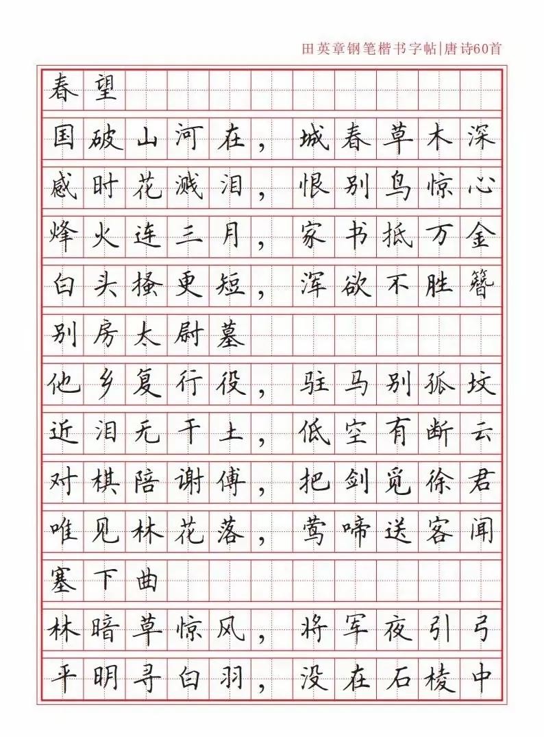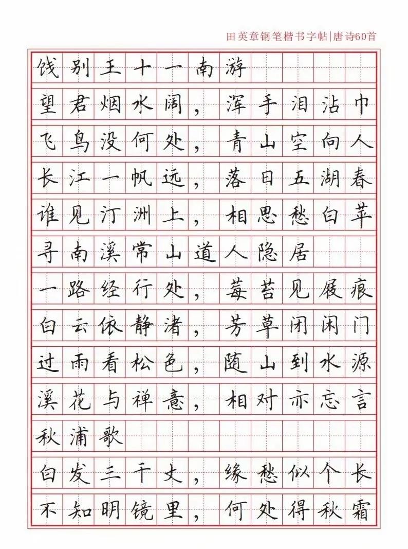 总之,田英章的硬笔书法《唐诗60首》以其规范的字体、精湛的技艺、深厚的文化底蕴,成为硬笔书法艺术中的经典之作,为我们展现了一个充满诗意与美感的书法世界,让我们在喧嚣的现代生活中,寻得一方宁静的文化净土,领略到硬笔书法与古诗词碰撞出的独特艺术火花。
