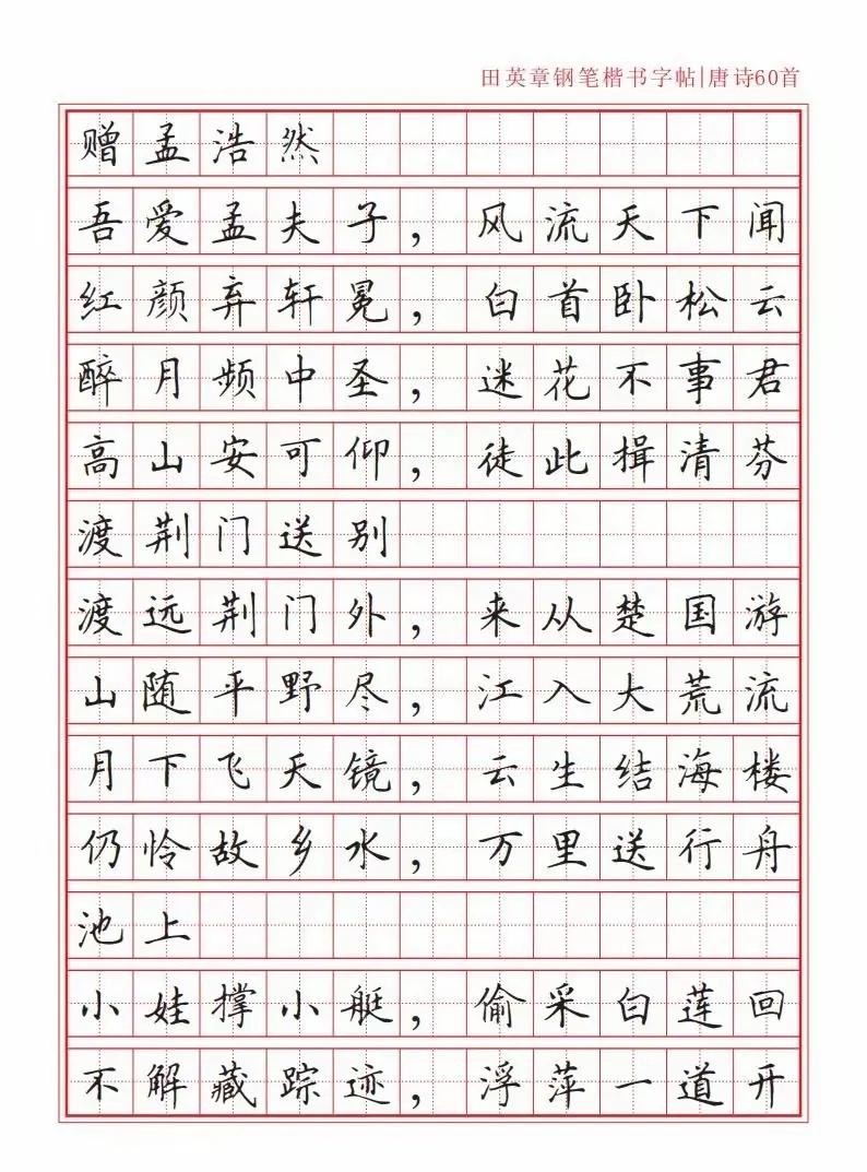 在硬笔书法的广袤星空中,田英章宛如一颗璀璨夺目的巨星,闪耀着独特而迷人的光芒。他以深厚的书法功底和对传统书法艺术的虔诚传承,在硬笔书法领域树立起了一座巍峨的丰碑,其硬笔书法作品《唐诗60首》非常优秀,此作备受推崇,散发着无尽的艺术魅力。