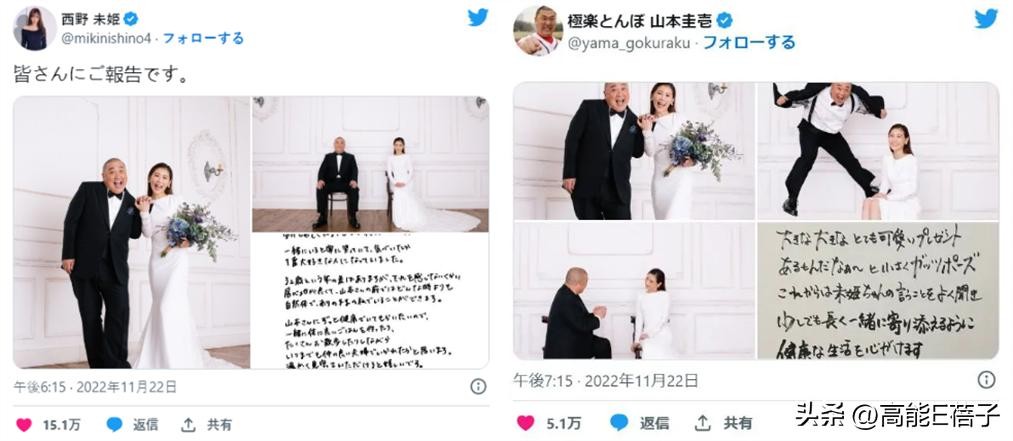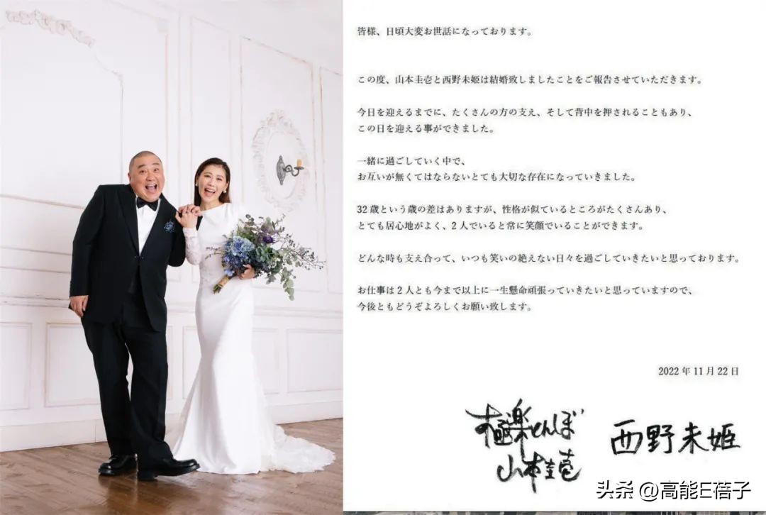 22日,前AKB48成员西野未姬与55岁山本圭壱同时在社交平台发手写信和婚纱照,宣布两人结婚喜讯。