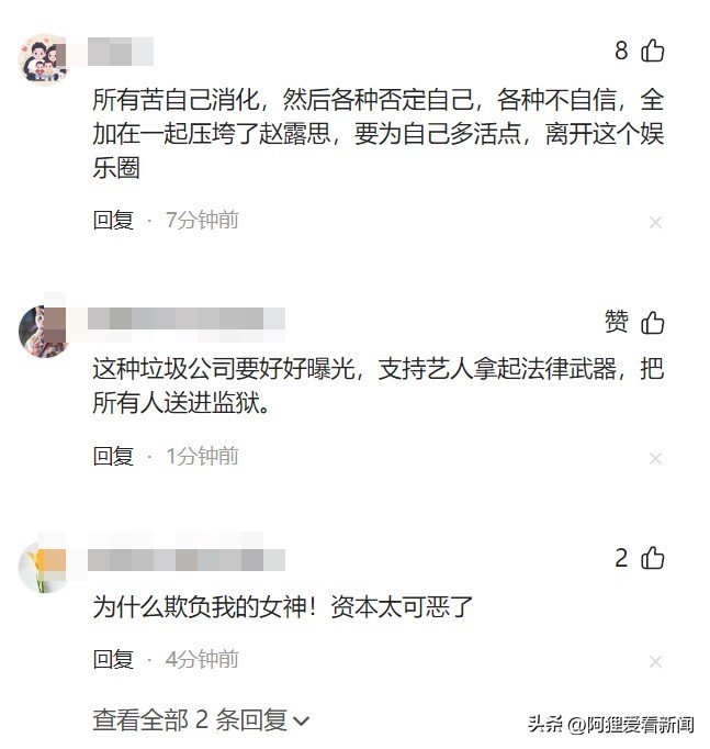 有网友说到,这样的公司就要好好的曝光,艺人也是人支持拿起法律武器保护好自己,希望露思以后要多为自己活着点,健健康康的。