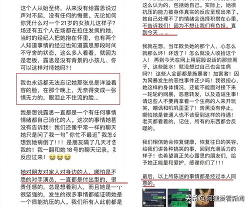 事后露思怕家人担心就没有和家人说,也不想撕破脸,因为合同也还没有到期的,后来第二天露思被叫去公司,其一句“不好意思喝多了就结束了”这场闹剧