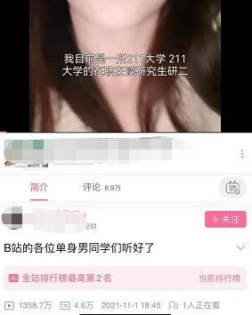 早前,B站一位研二的女生发布了一条“求偶”视频,内容包括其自身情况、兴趣爱好以及对另一半的要求,从身高到星座,事无巨细,谈恋爱她是认真的。这段朴素的相亲VCR播放量高达1300多万,播放量全站最高排名第二位。