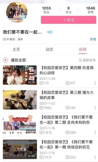 除此之外,湖南一高校学生为解决同学的“脱单危机”,选择自制恋爱综艺,在校内海选3男3女6名大学生参加节目,通过互动性较强的活动,用镜头记录同学们的真实反应,最后让男女嘉宾选择是否在一起。该节目B站播放量高达10万,评论区不少网友表示“嗑到了”、“追韩综不如看大学生的甜甜恋爱”。