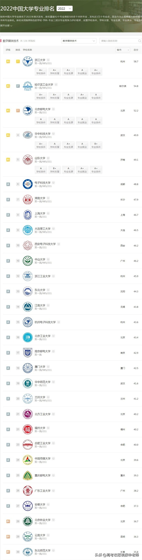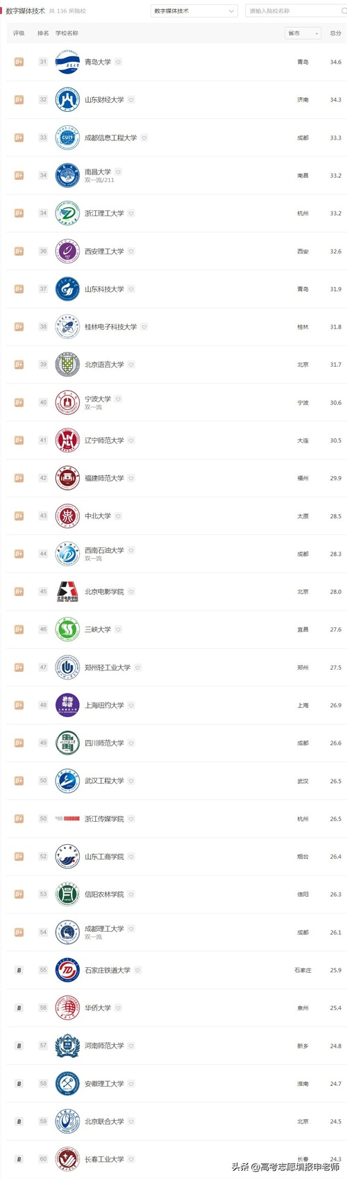 可以重点考虑计算机科学与技术、软件工程和设计学有优势的大学,如果学习偏编程方向,可以选计算机、软件强的大学,可能参考学科评估。如果学习偏动漫设计或影视后期的方向,可优先选择设计学强的大学。附上软科的专业排名,供参考。