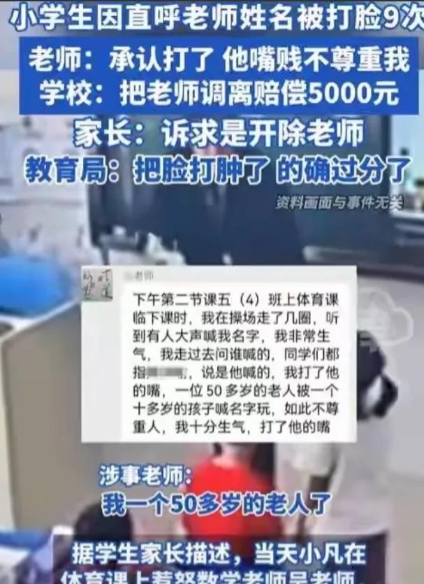 再说最近火热的教师因学生大声呼喊(戏谑口气)其姓名,教师愤怒下打击脸部,据说是九下,造成脸部淤青。家长要求开除这名老教师的事情。
