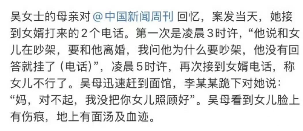 吴女士的母亲向新闻周刊记者,回忆那一天发生的事情,她记得女婿李某某,当晚总共给她打了两个电话。一个是凌晨3点,女婿李某某说和妻子吴女士吵架了,还说两个人要离婚。