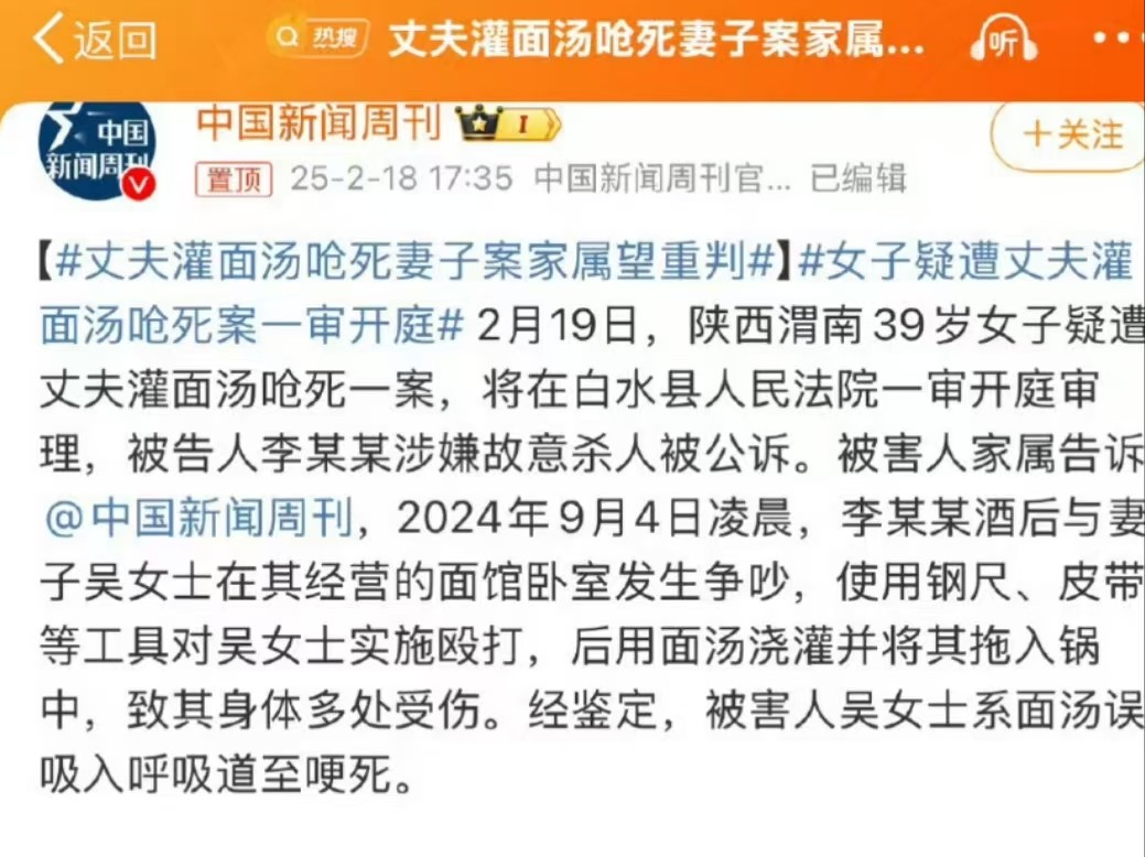 遭丈夫灌面汤呛死女子家属发声:他想让谅解他,不想被重判
