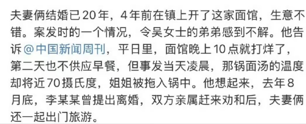 说直白点这就是典型的“虐杀”,又是灌面汤,又是将妻子拖入面汤锅中,直到其死亡。
