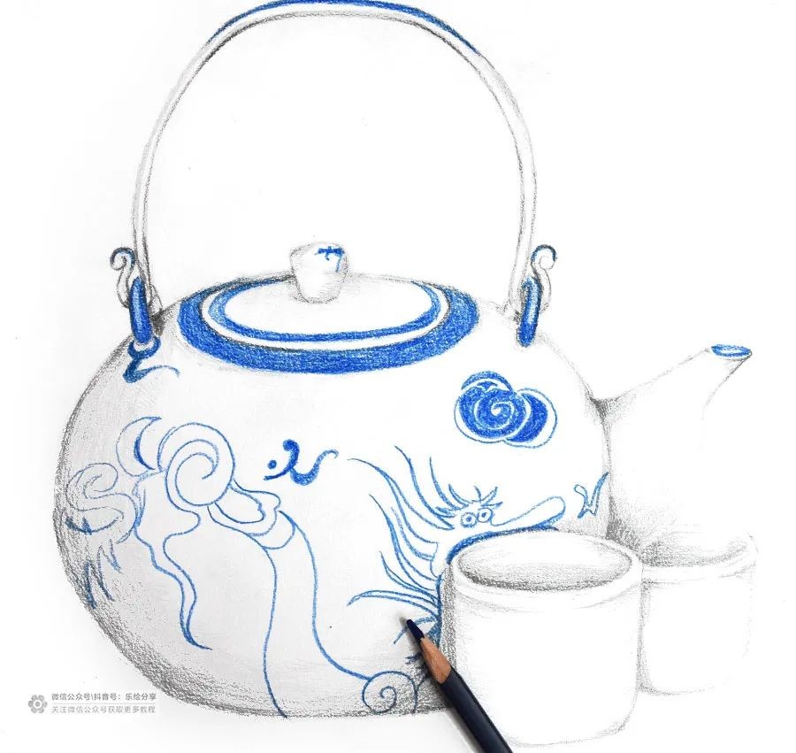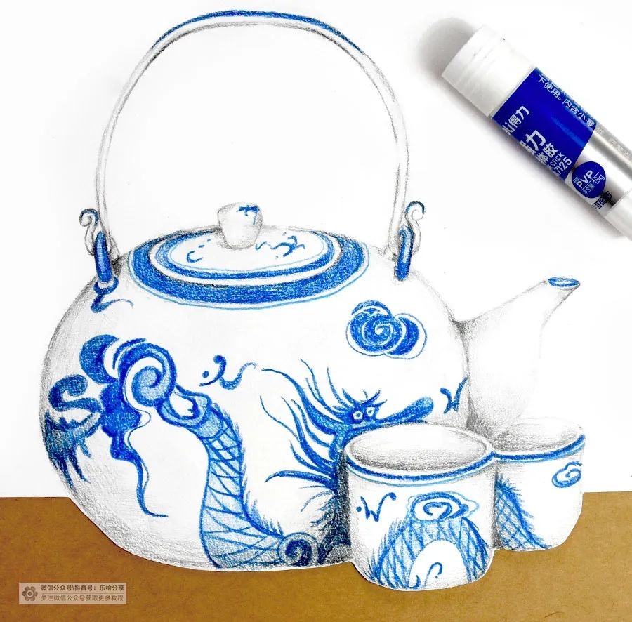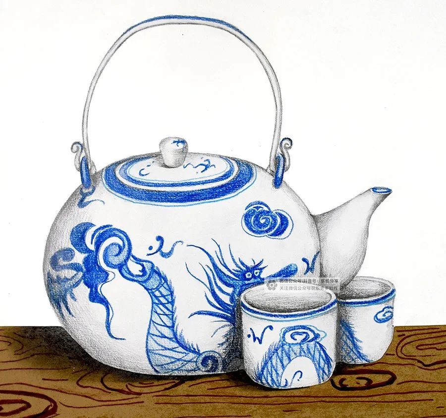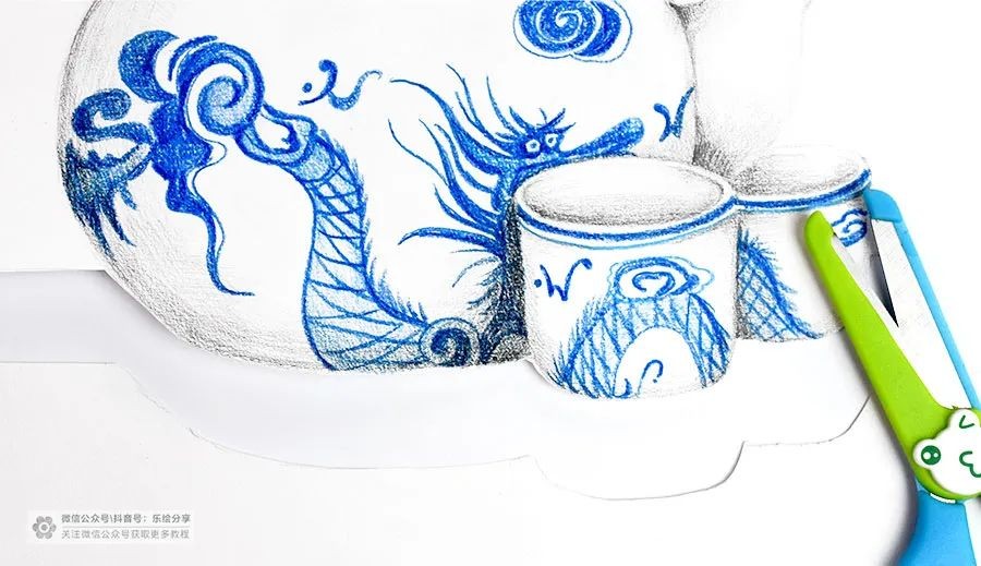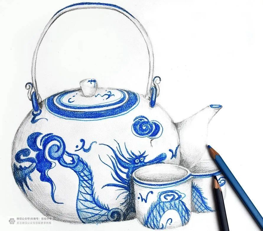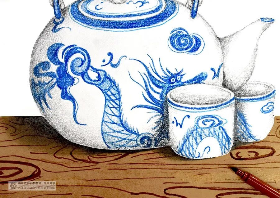 并结合靛蓝色的彩铅来表现青花花纹