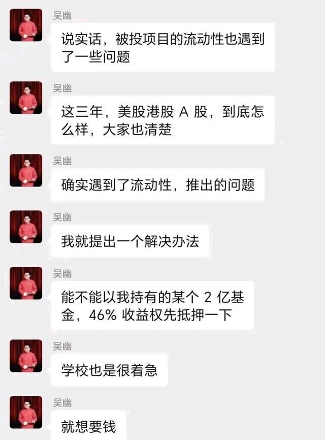 吴幽本人表示自己的企业现在出现了危机,他自己目前也很困难。昔日母校在这个时候将吴幽告上法庭是有些不讲情面,毕竟买卖不成仁义在。虽然母校做的很绝情,但是吴幽还是表示会将这笔钱捐赠给母校。他这个态度已经是很好了,只是要给他时间来周转。学校做的这么绝,丝毫不给自己留后路啊。不要把人逼的太紧,兔子急了还咬人呢。